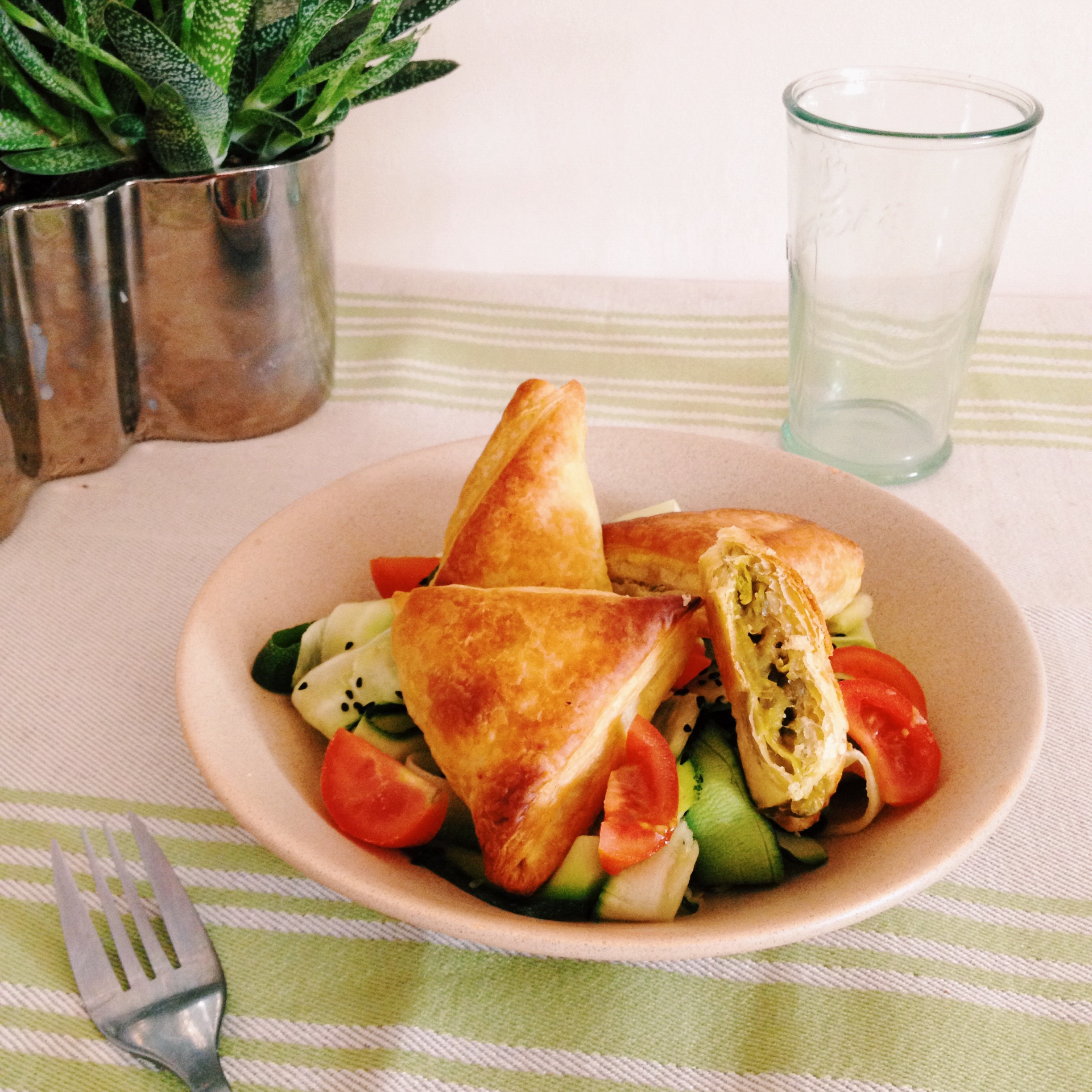 Dans mon congèlo, un reste de petits pois gentiment offert par le voisin l’an dernier et une pâte feuilletée qui demandait à être utiliser. Voilà comment m’est venue l’idée de ses petits triangles. Accompagnés d’une salade de courgettes crues aux sésame noir et voilà un petit repas tout en légèreté.