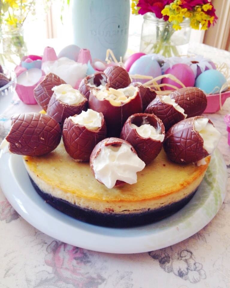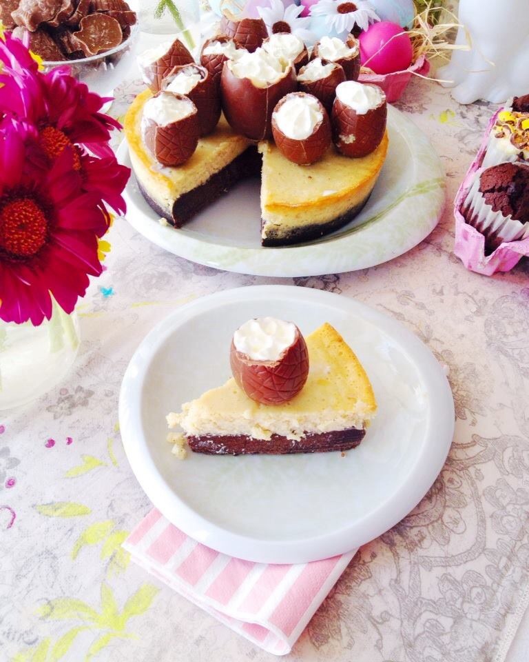 Pour la deco, rien de bien extra. Des oeufs en chocolat que j’ai découpés et garnis d’une crème chantilly à la vanille. Laissez libre court à votre imagination et amusez vous.