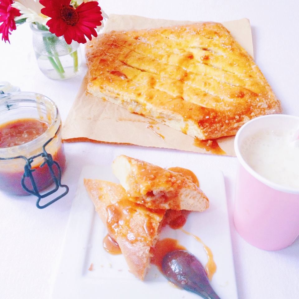 Tartiner de caramel, recouvrir de compote et terminer par l’autre couche de brioche. Souder bien les bords pour que la garniture ne s’échappe pas.