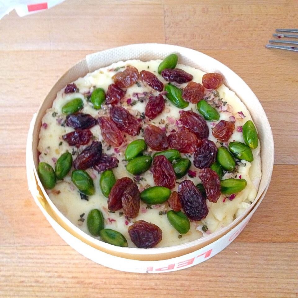 1 camembert (avec une boîte en bois) votre choix, 1 poignée de pistaches et de raisin secs