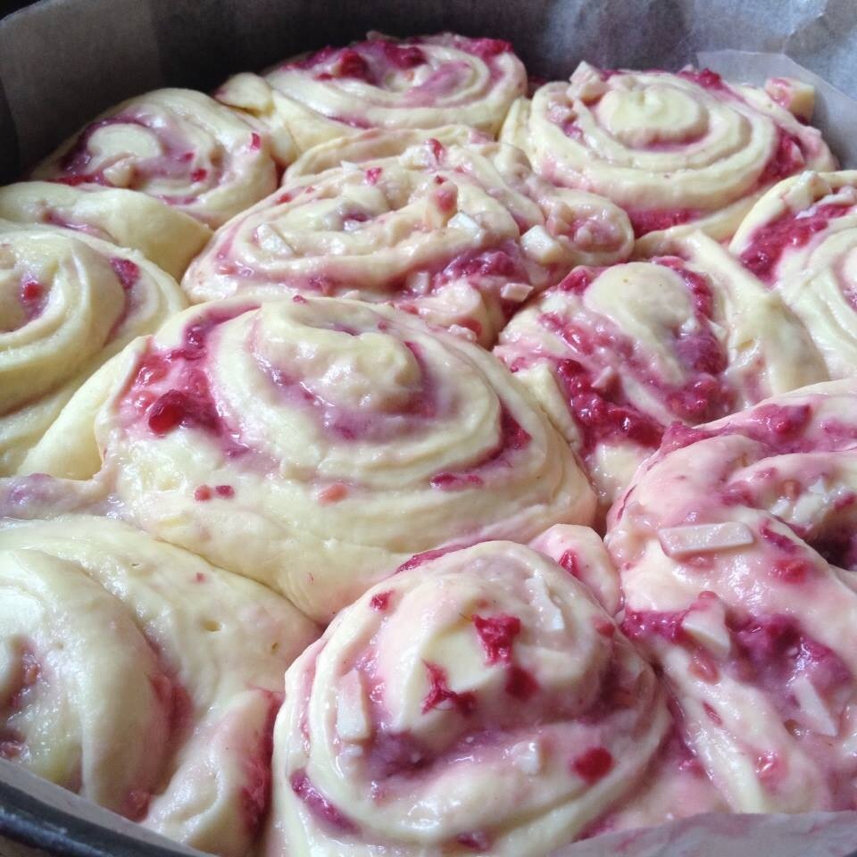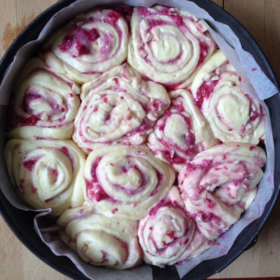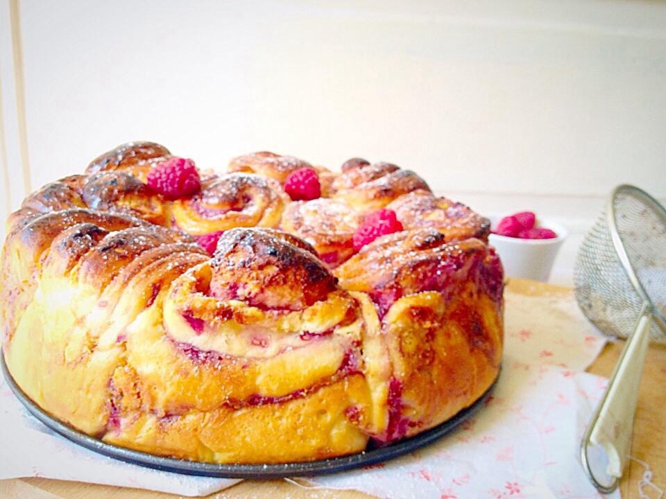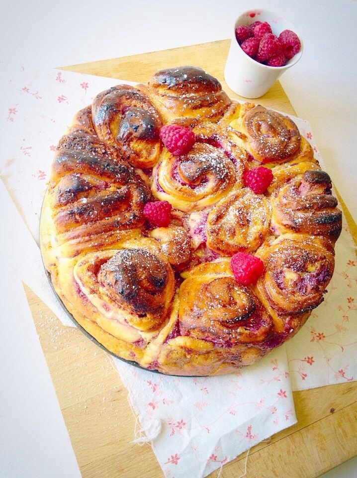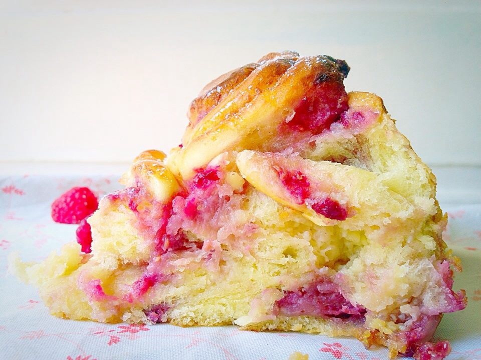 Aujourd’hui c’est avec un chinois aux framboises (toujours celles de mamie), à la crème pâtissière au lait de coco et pépites de chocolat blanc que je débute ce weekend gris, orageux et pluvieux.