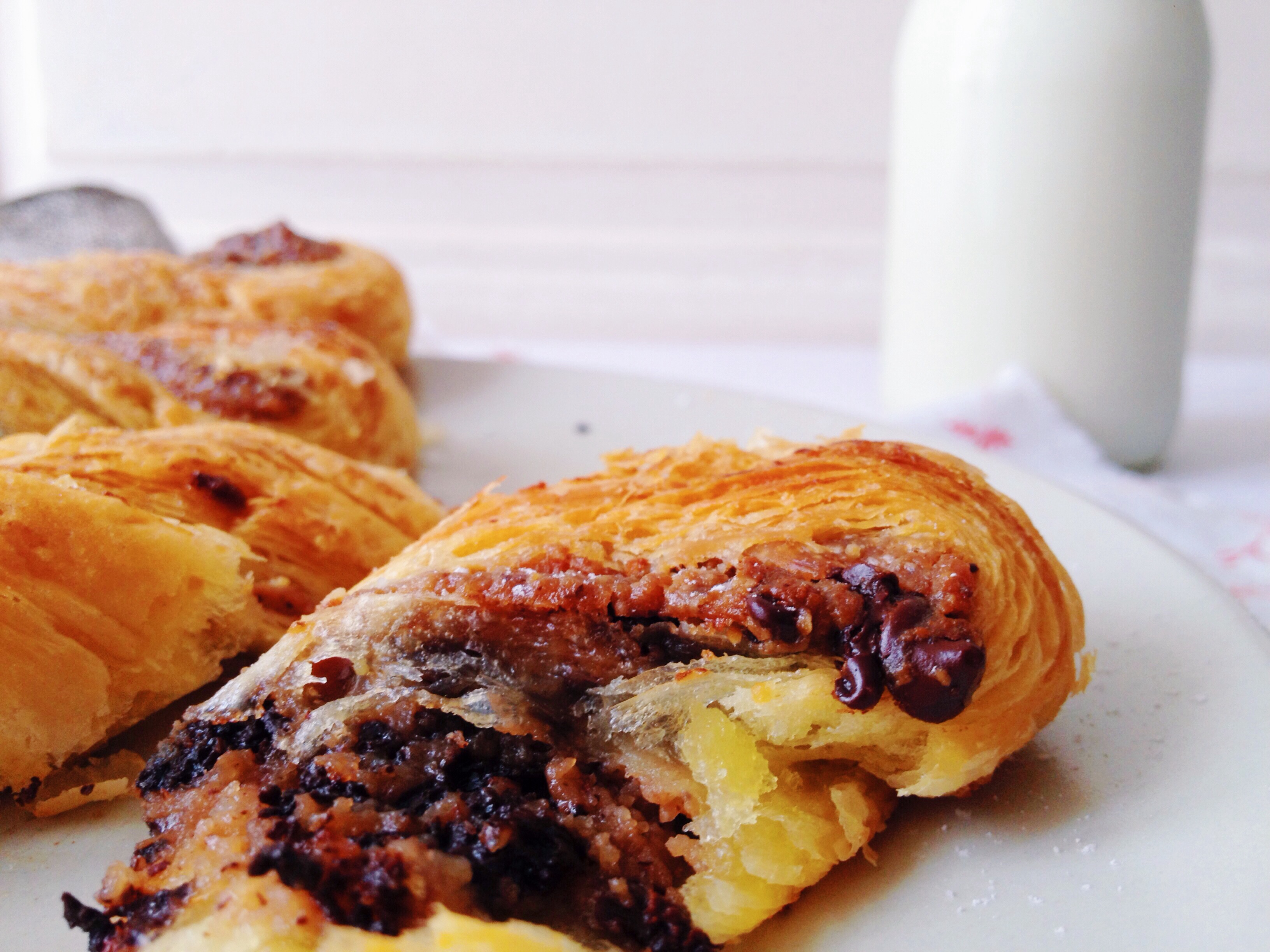 Aujourd’hui j’ai eu envie de vous proposez des petites torsades feuilletées à la crème pâtissière et aux pépites de chocolats.