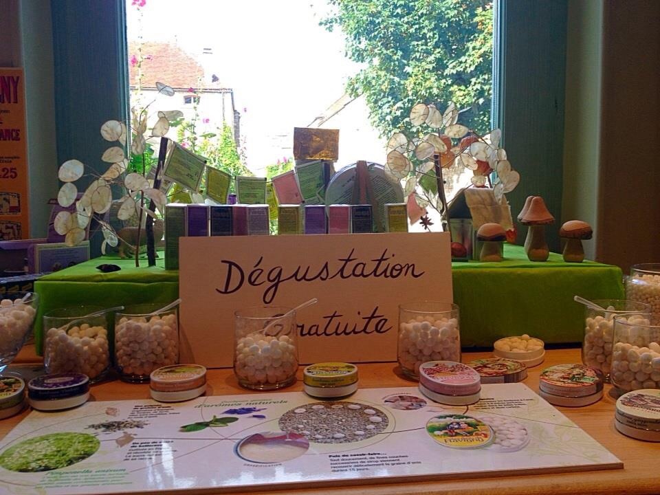 Sur la droite un étal avec des produits de la régions et différentes spécialités : pains d’épices, biscuits de Semur…