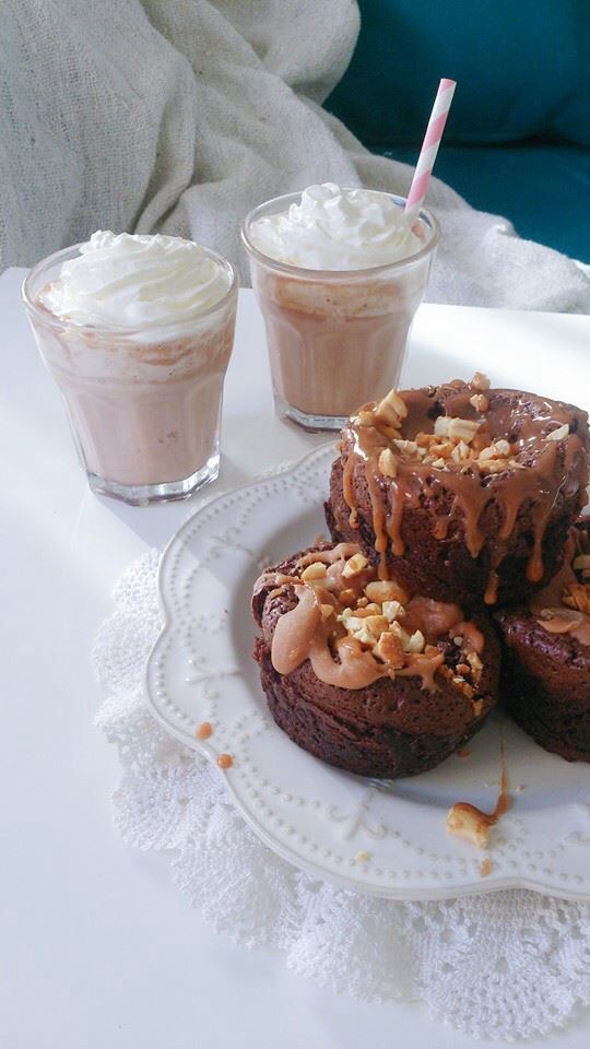 Remplir à moitie des moules à muffin, ajouter 1cc de beurre de cacahuète et recouvrir de pâte