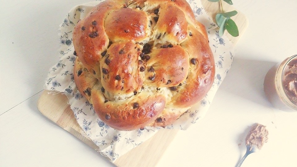 Pour l’accompagne, j’ai fais une brioche du Boulanger aux pépites de chocolat, toute simple mais tressée en rond. effet garantis pour vos petits déjeuner ou goûters