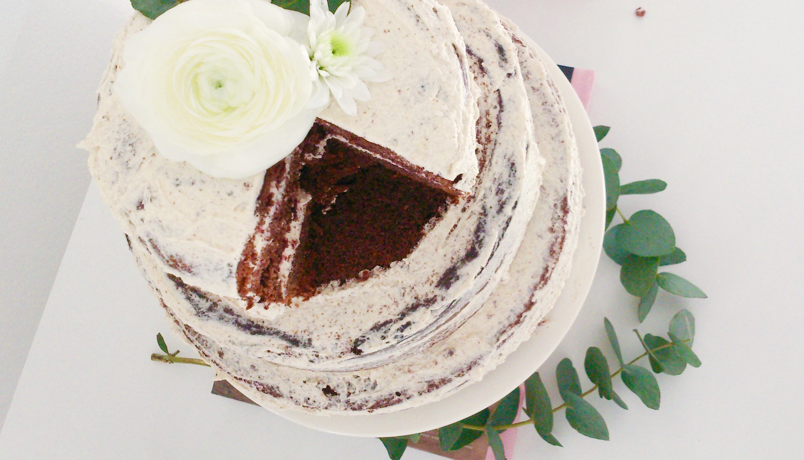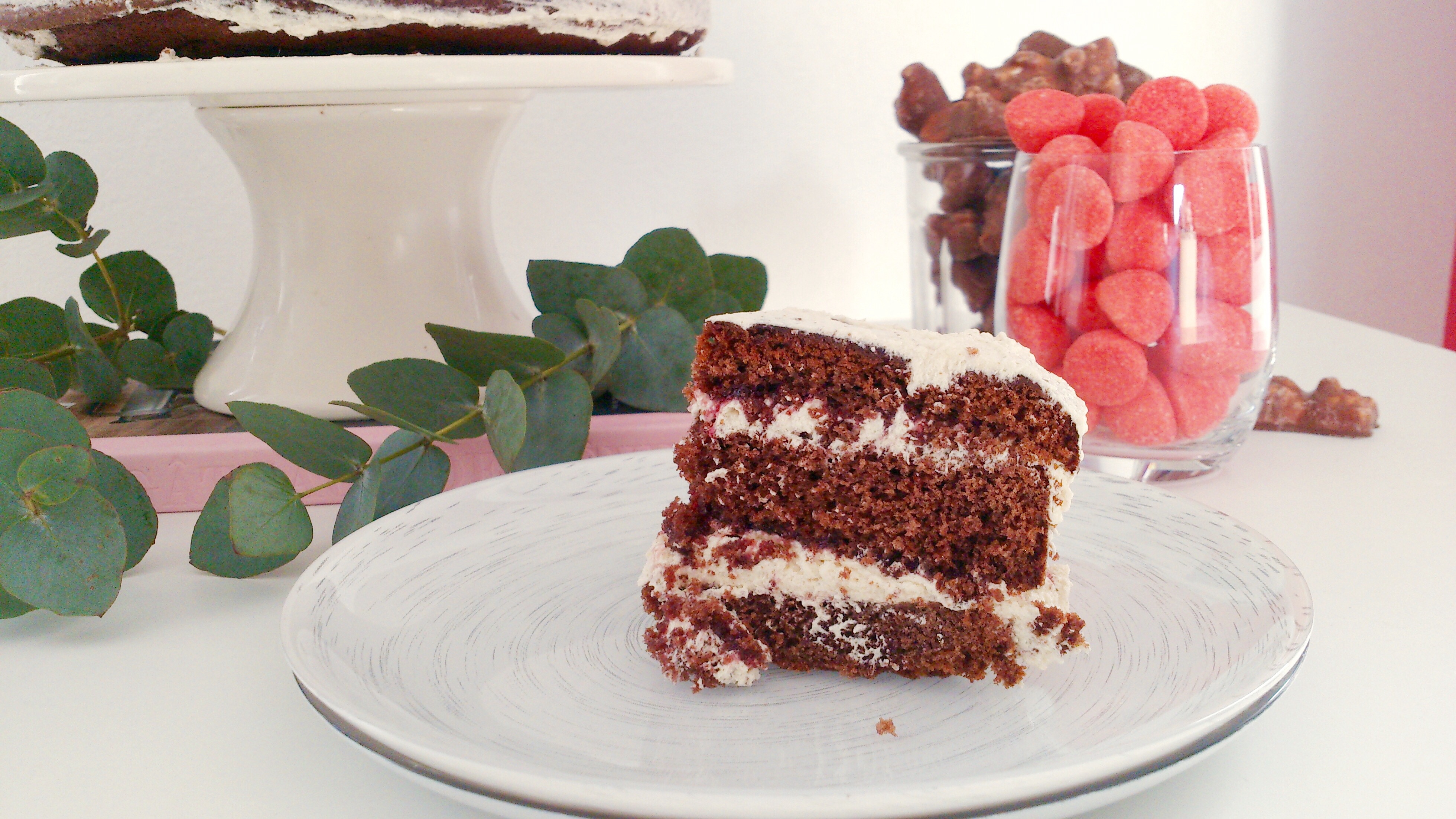 Une base de gâteau au yaourt au cacao très moelleuse et légère, recouverte d’une chantilly épaisse au mascapone et de fruits rouges. Le tout tartiné rapidement de crème. Je n’avais pas envie de le cacher sous une couche de crème.