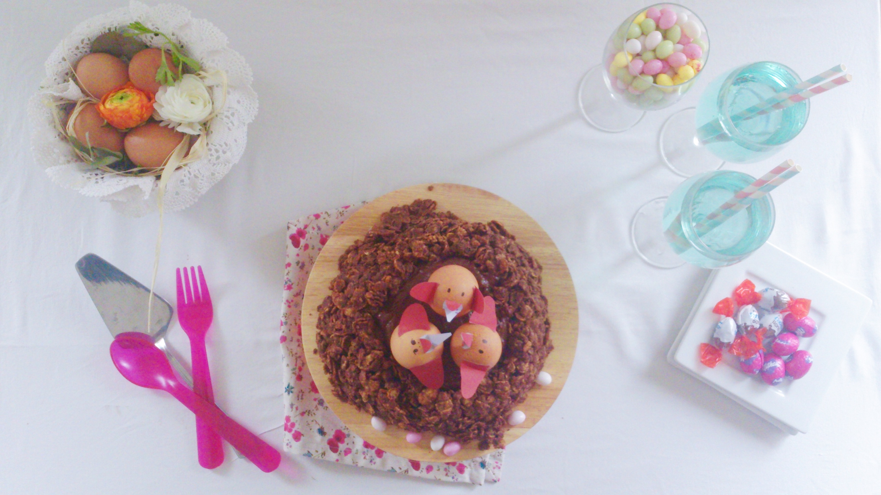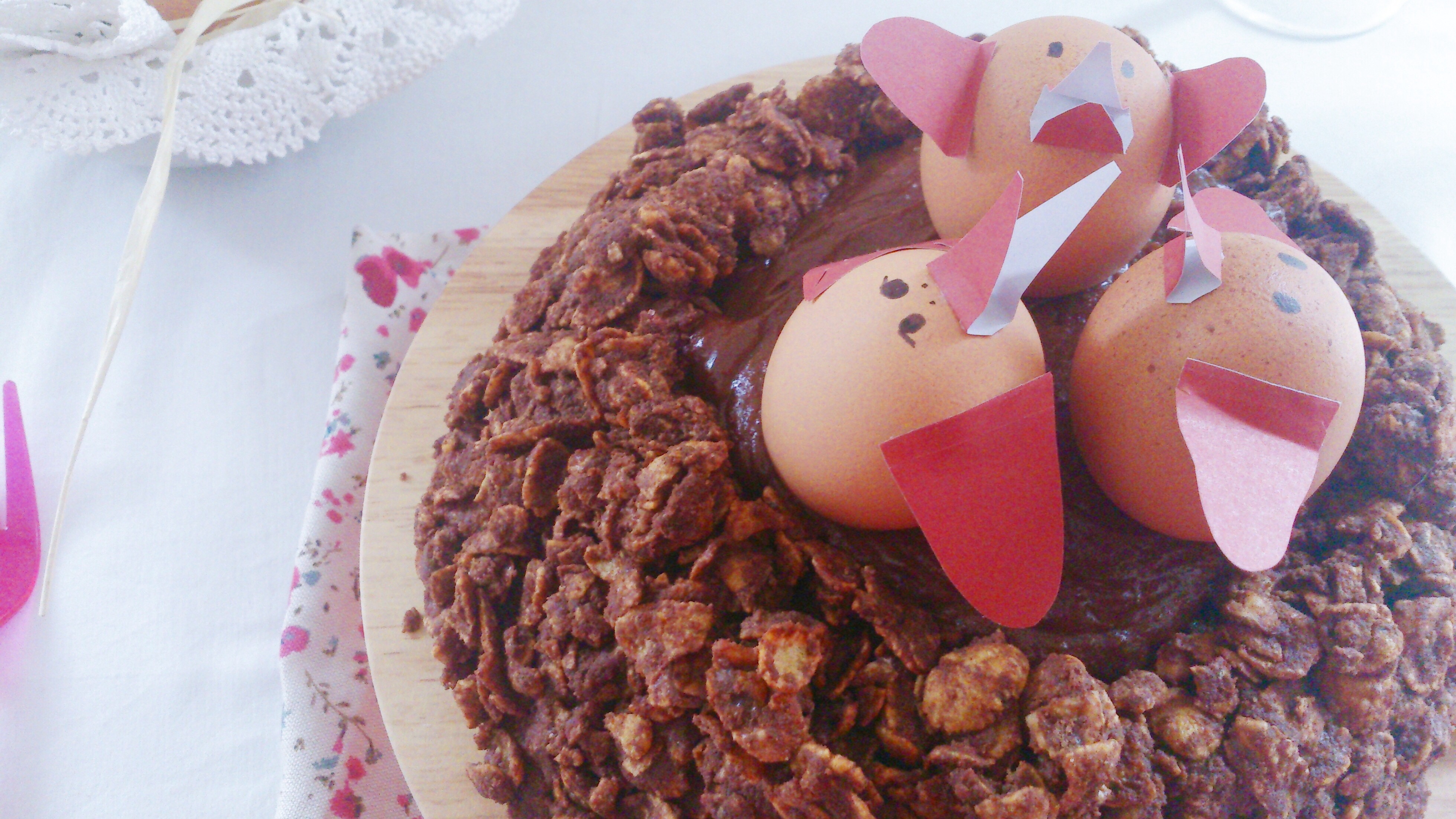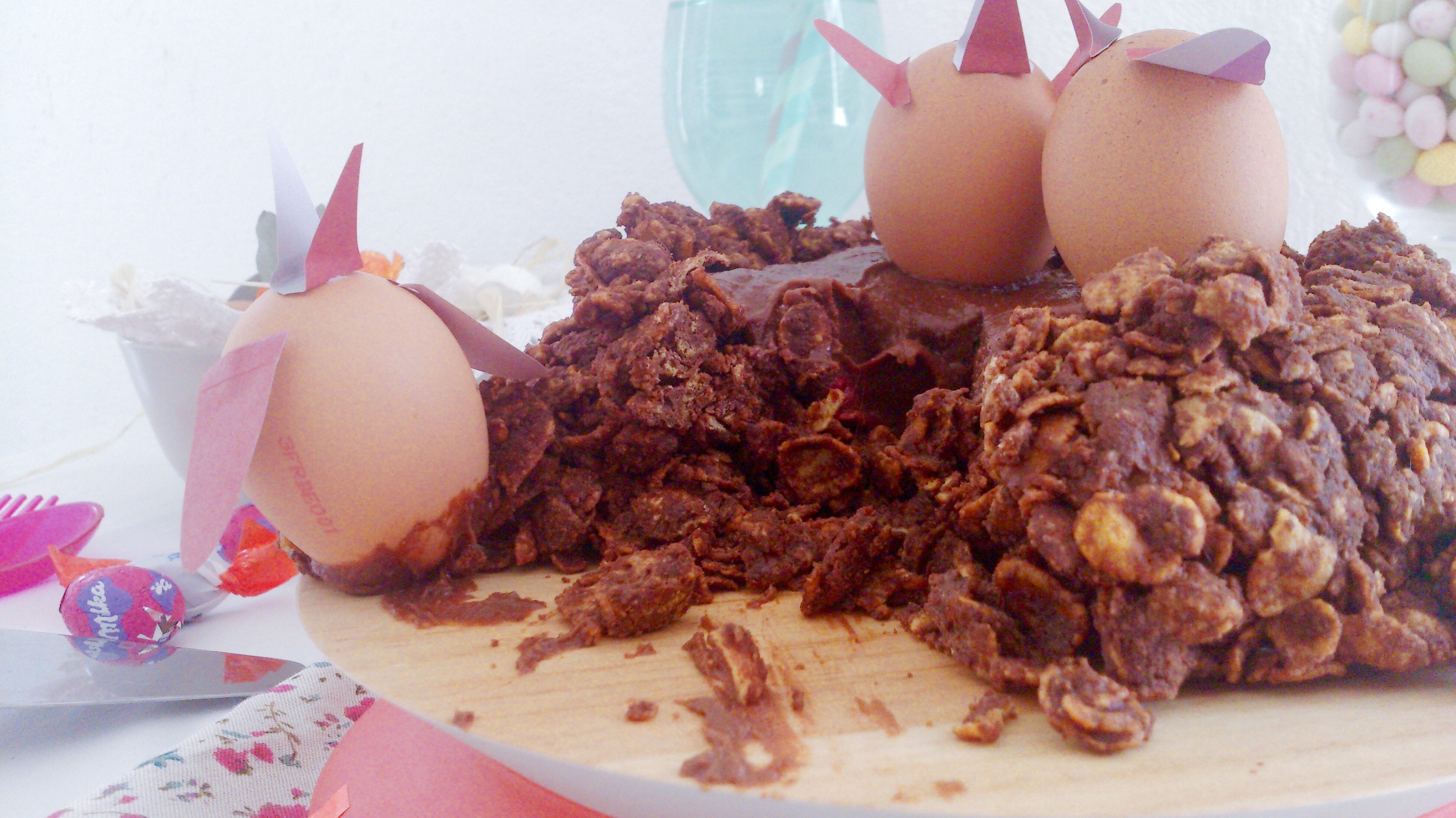 Nid de pâques façon rose des sables, crème choco-banane-framboises