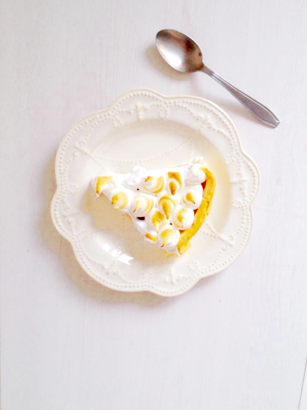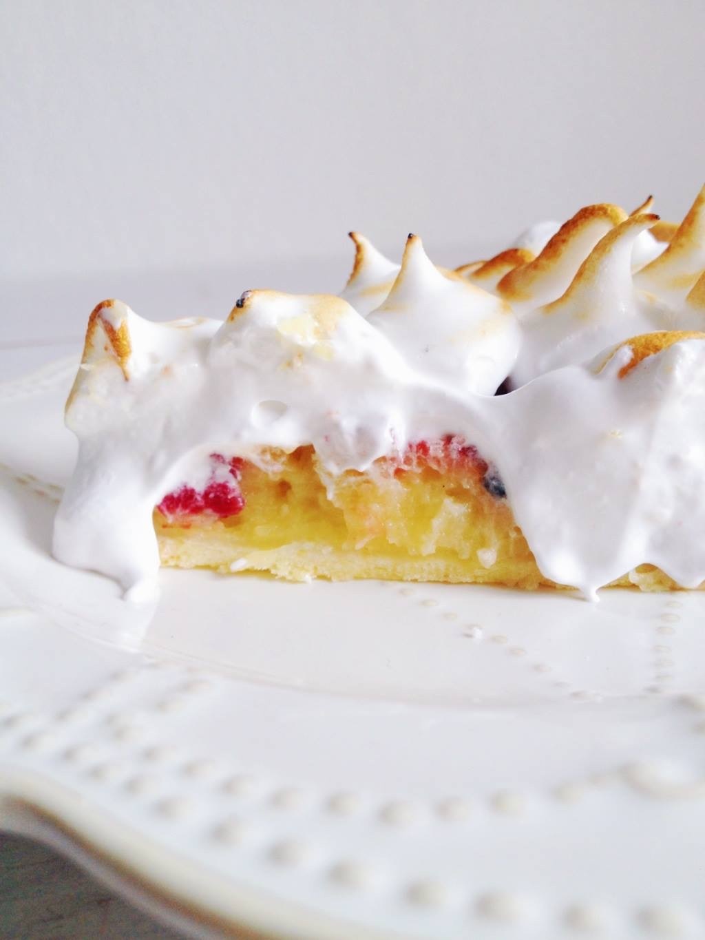 Elle est toute simple ; une pâte brisée croquante à l’huile d’olive(reçue récemment et très parfumée), une crème onctueuse au citron, quelques framboises et une meringue légère à peine grillée
