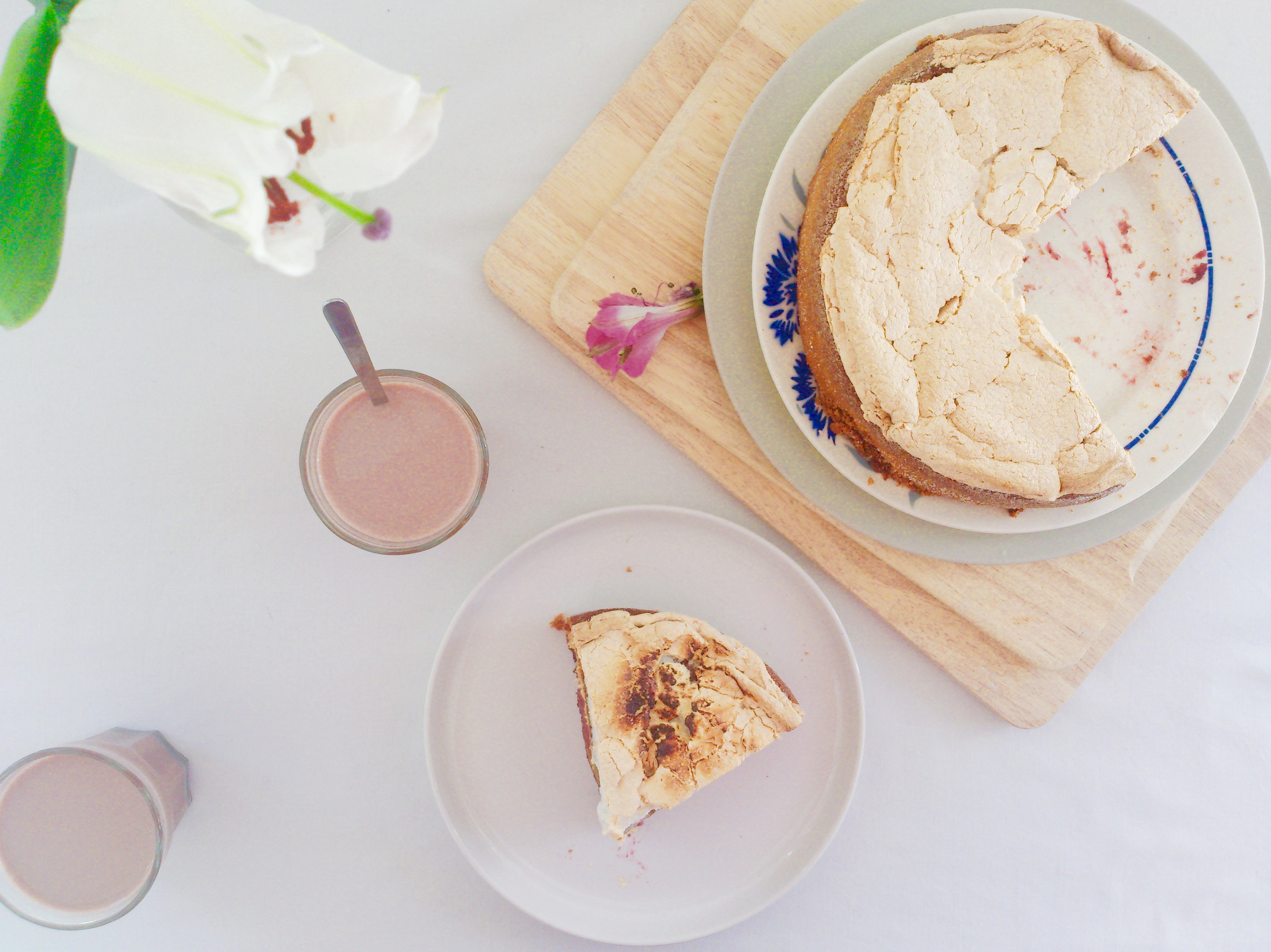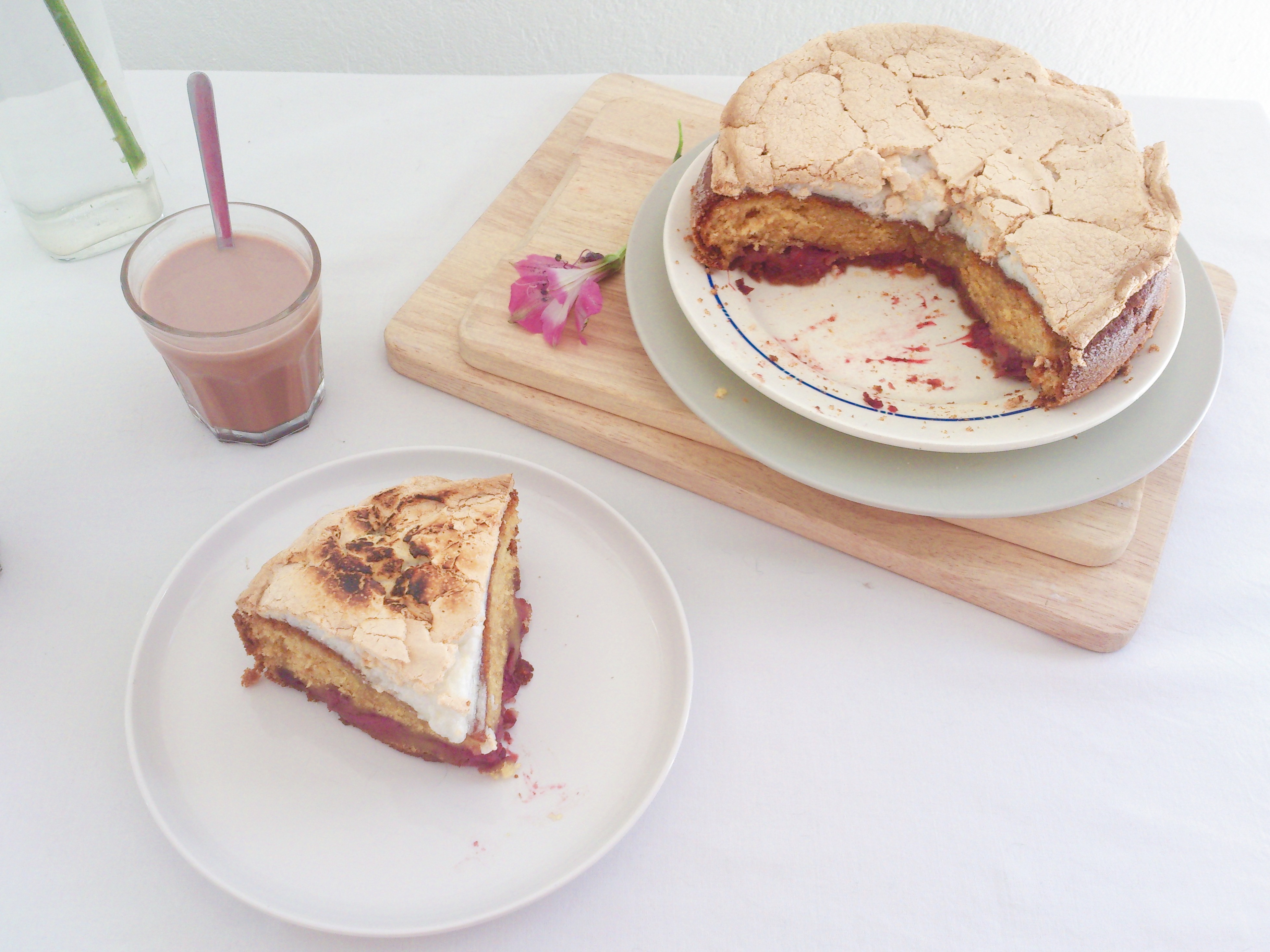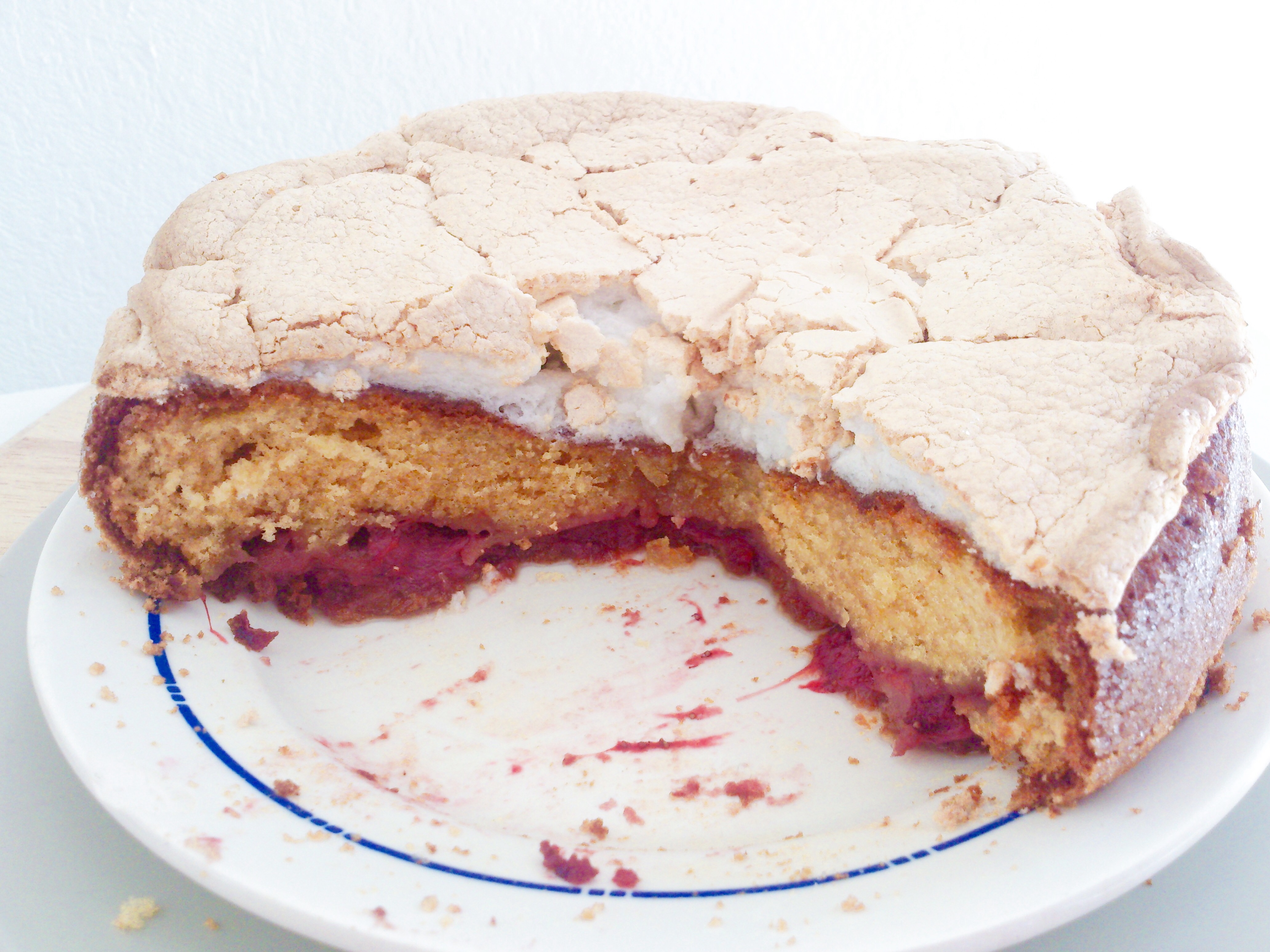 Le gâteau c’est effondré au centre, il n’était pas assez cuit quand je l’ai recouvert de meringue. Simple erreur de débutante, surveillez bien la cuisson 😉