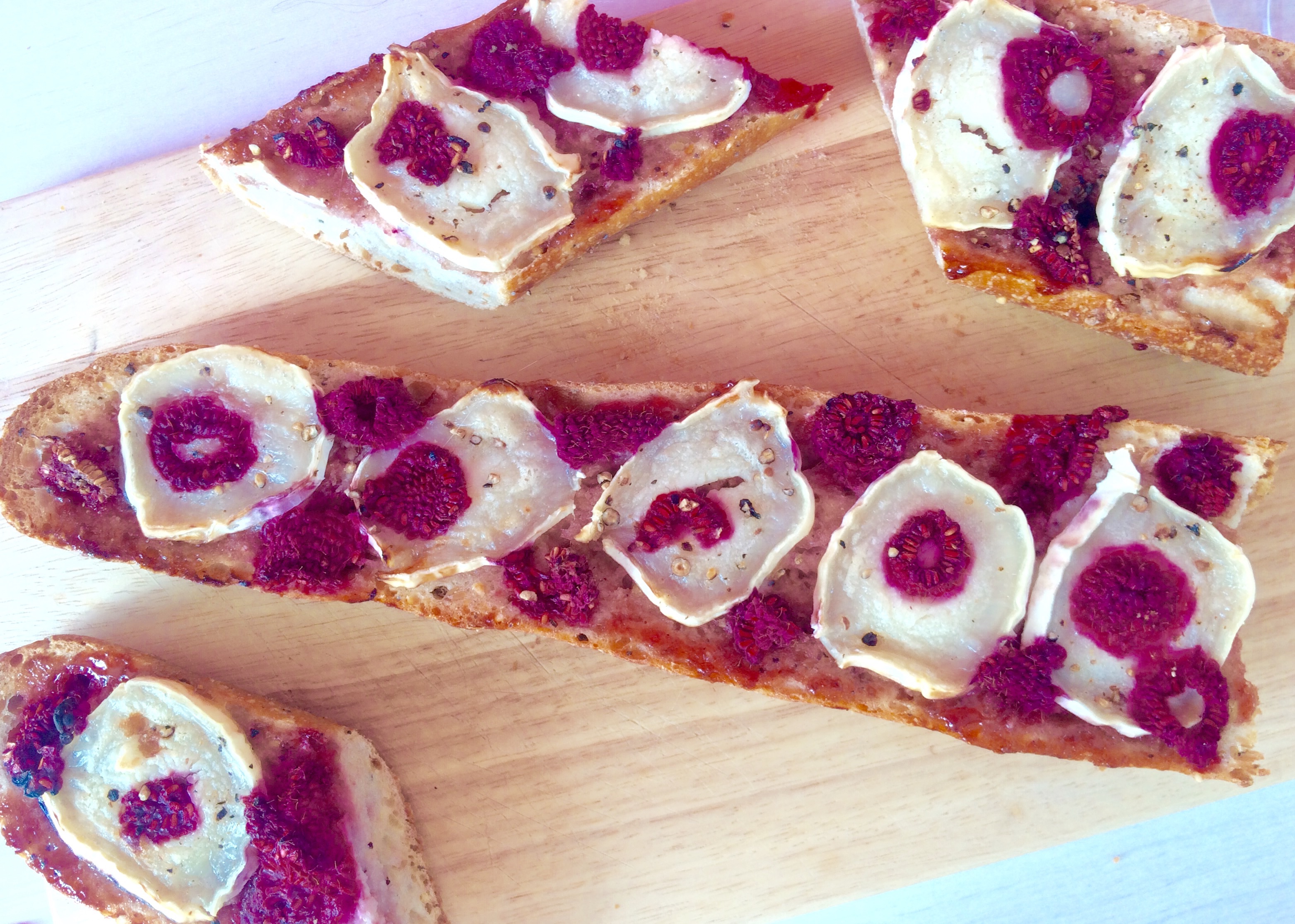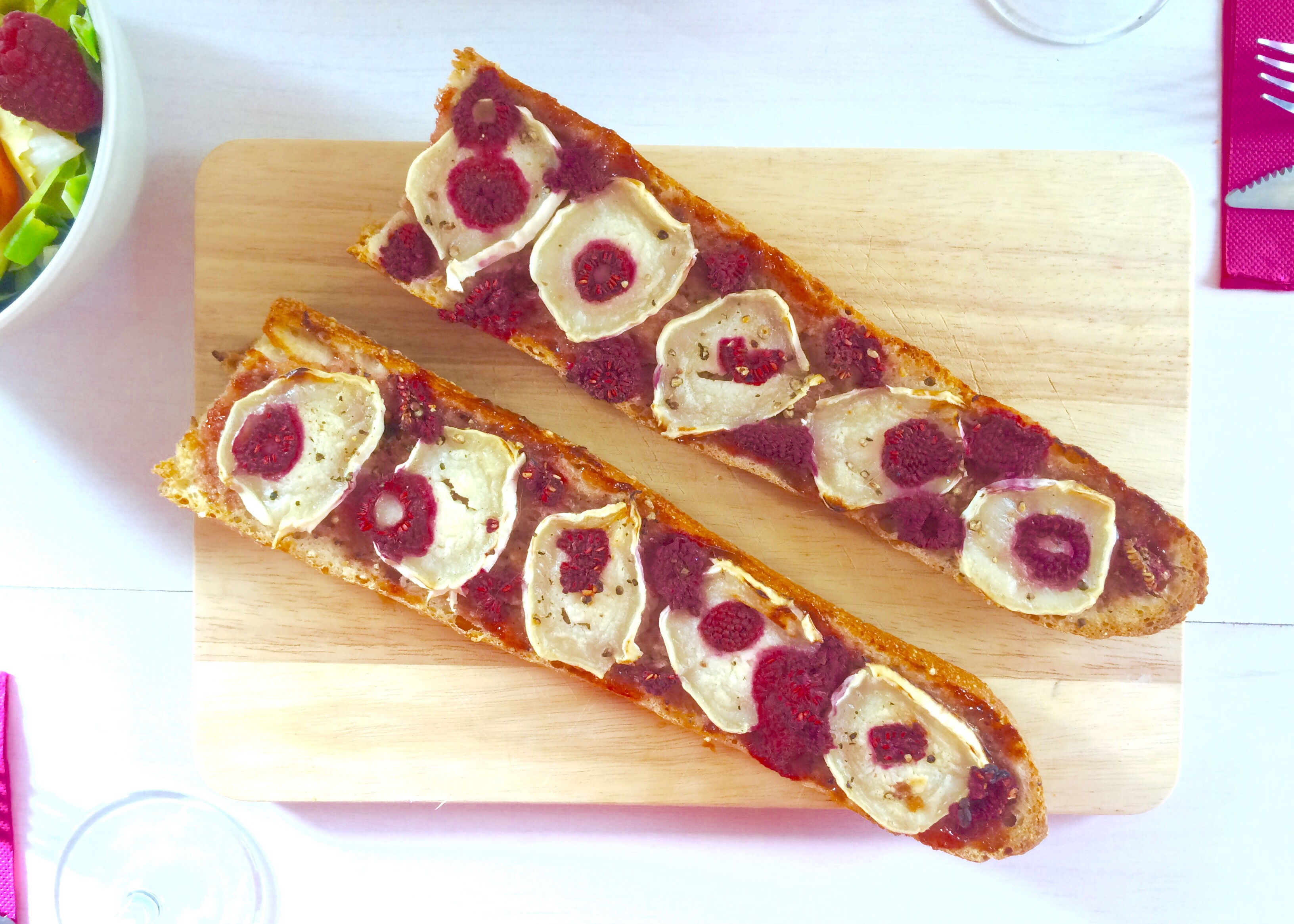 1 baguette de tradition française, de la sauce tomate, 1 buche de fromage de chèvre, 1 belle poignée de framboises fraîches(mais avec des surgelés ça ira très bien) sel-poivre