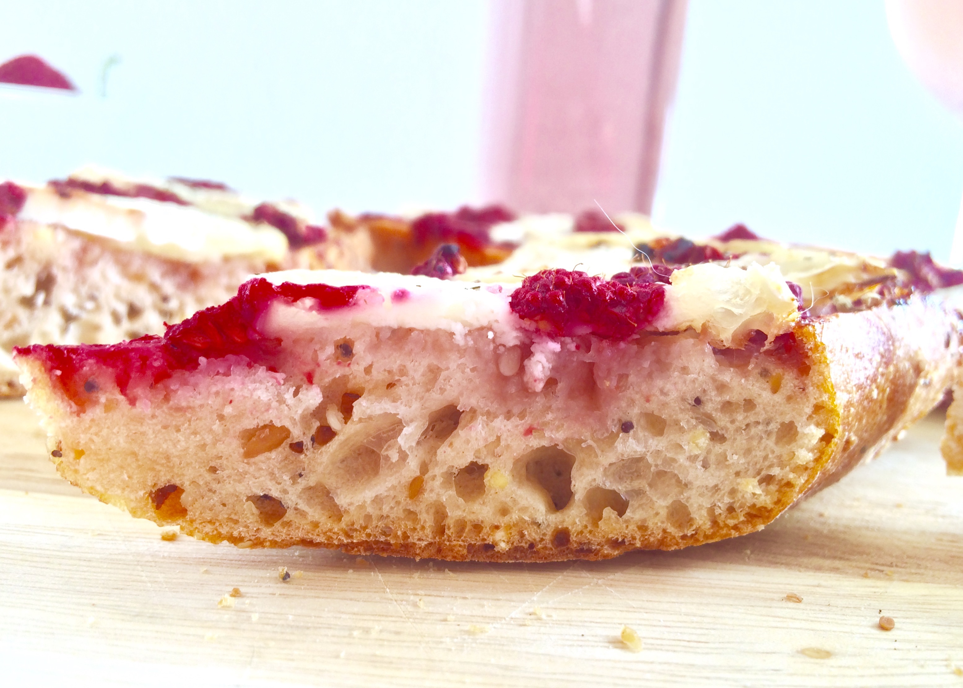 Tartiner toute la surface de sauce tomate et recouvrir de fromage et de framboises.