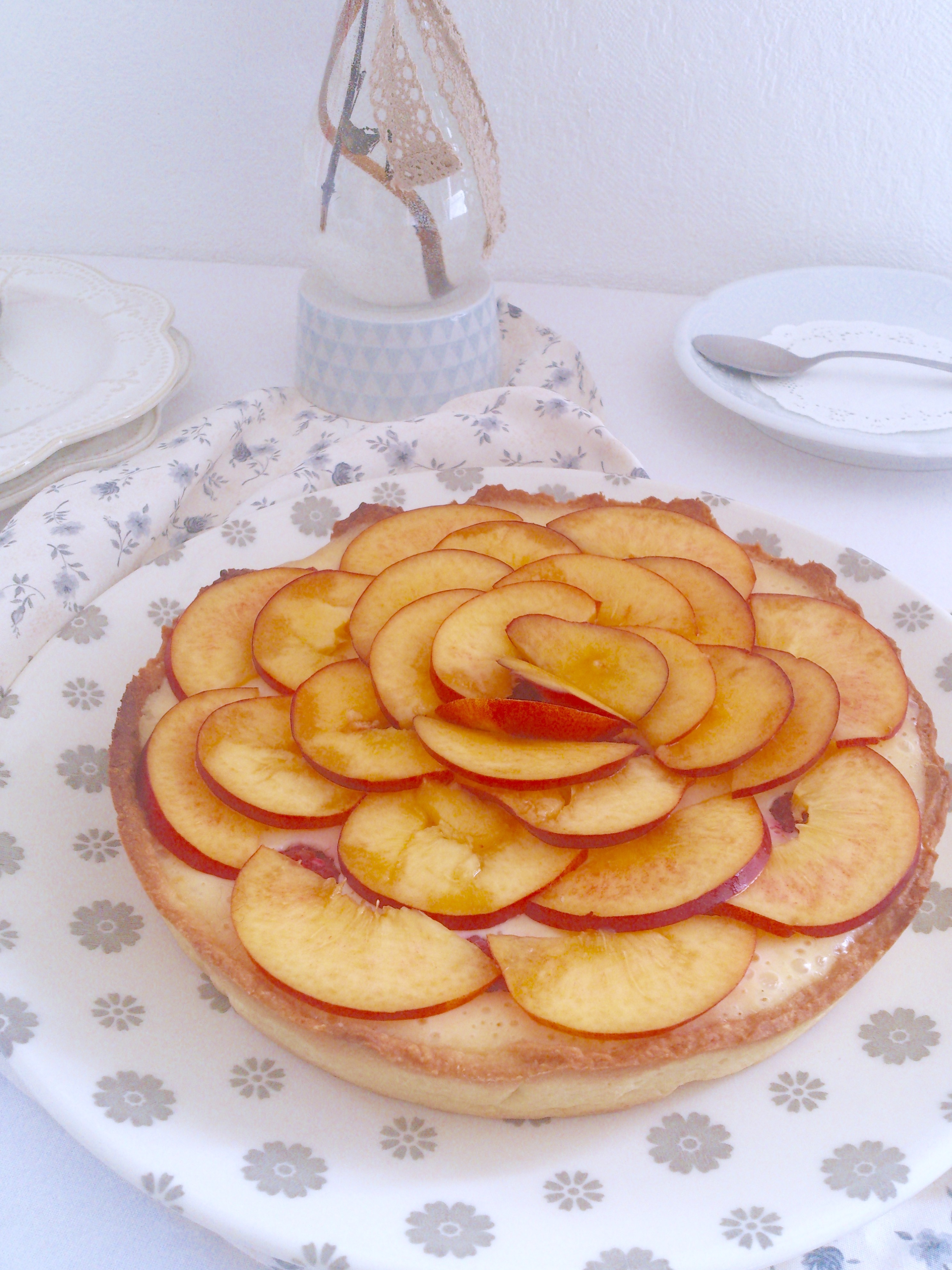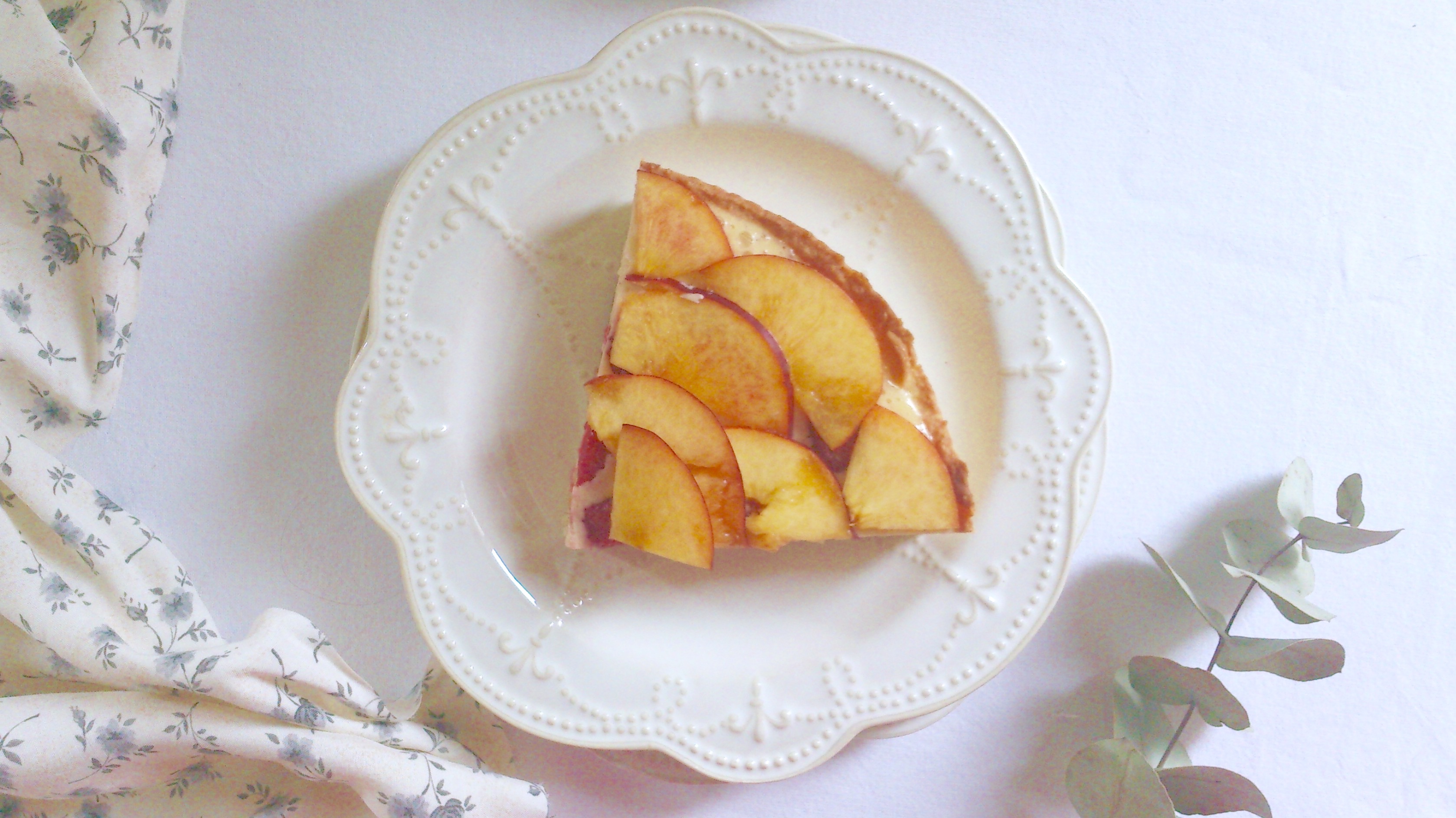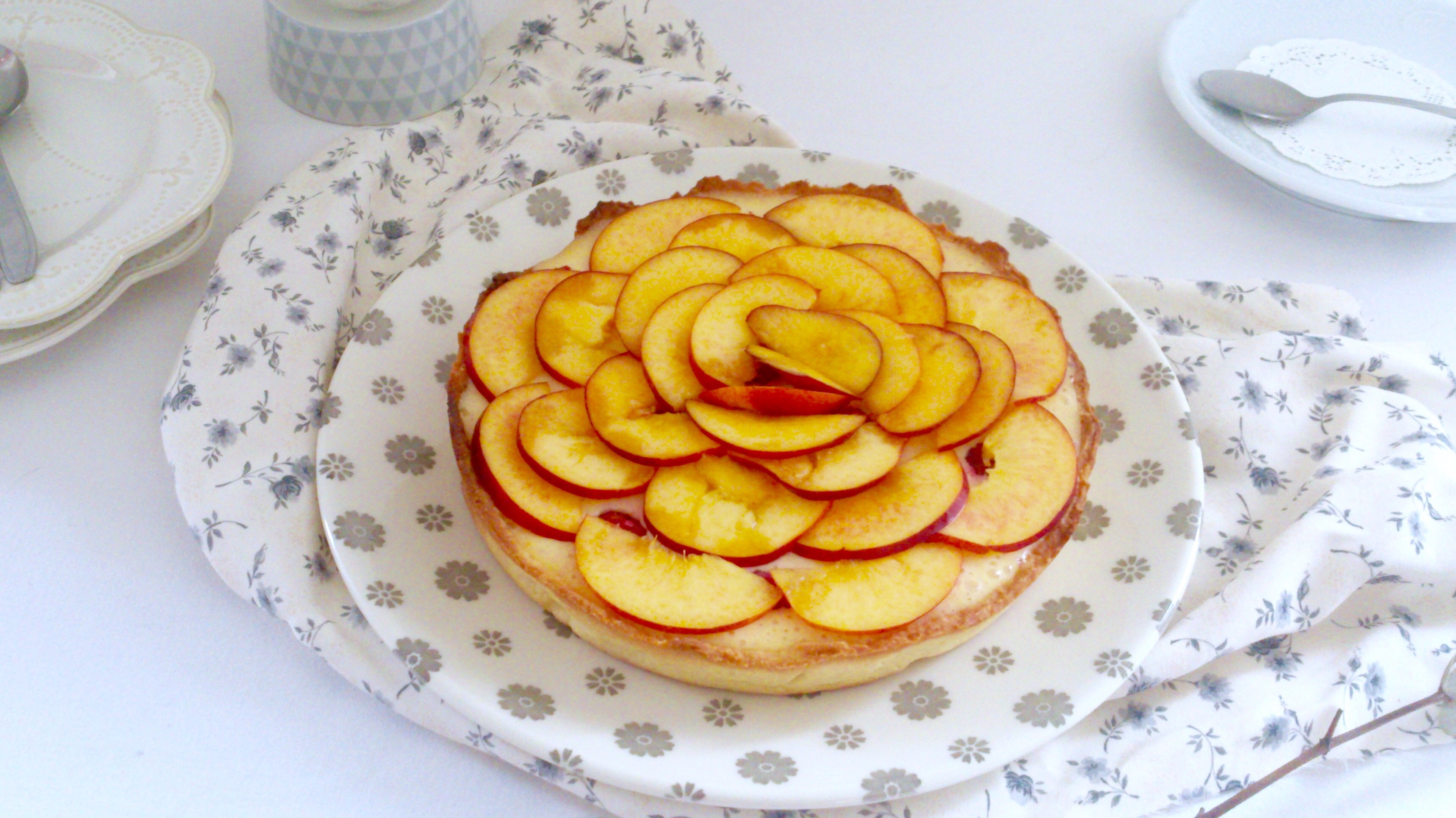 Au moment de servir, découper des lamelles de pêche et les déposer sur la tarte