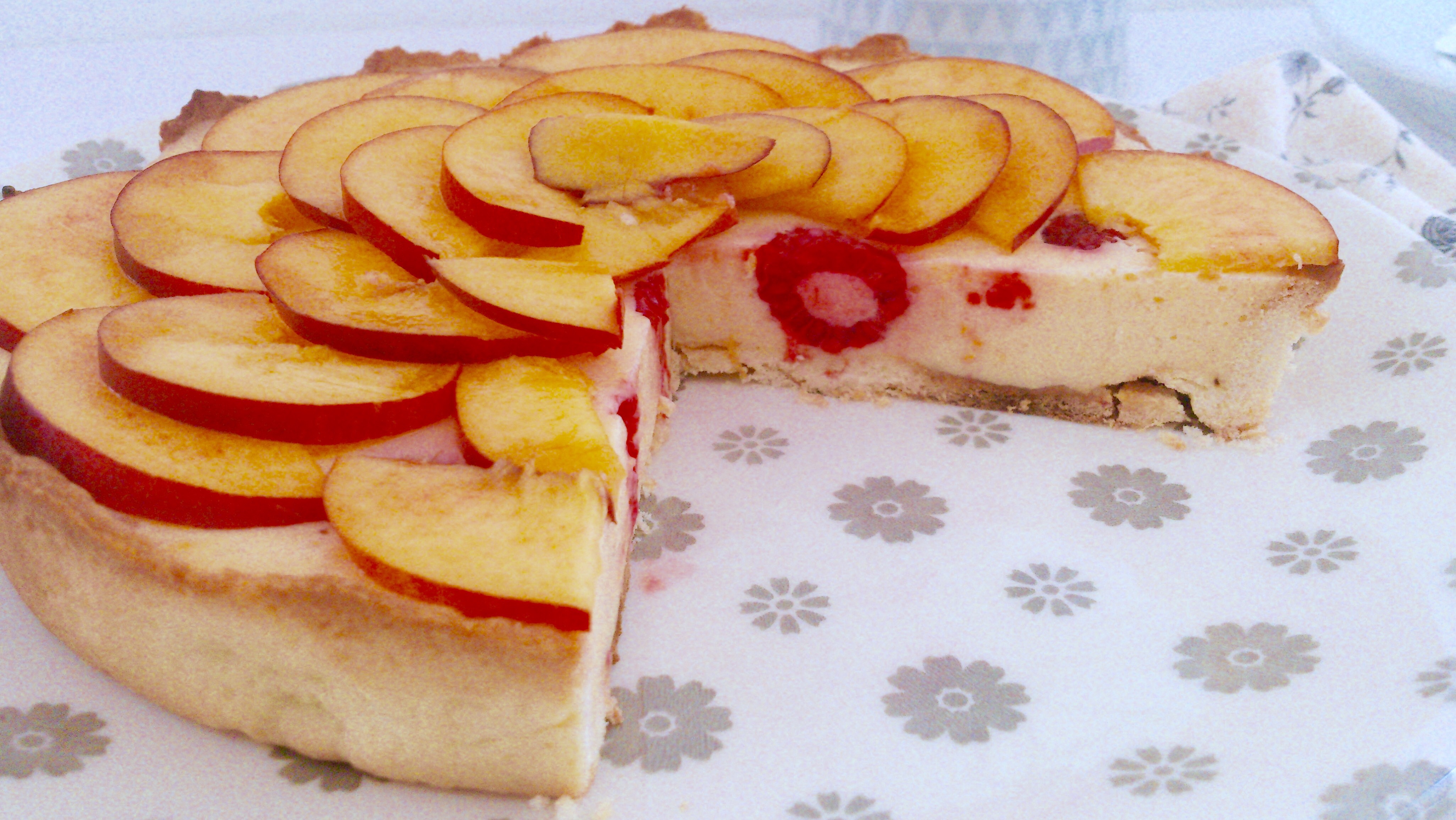 Des nectarines jaunes (les seules que j’aime) juteuse qui cachent une panna-cotta crémeuse à la pêche et aux framboises.