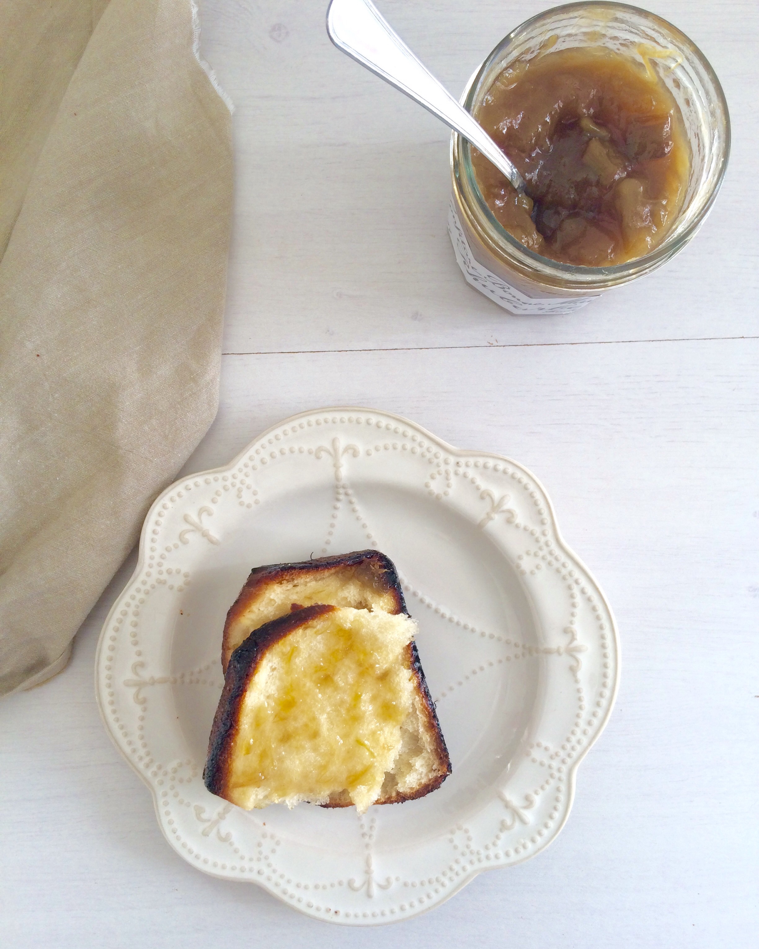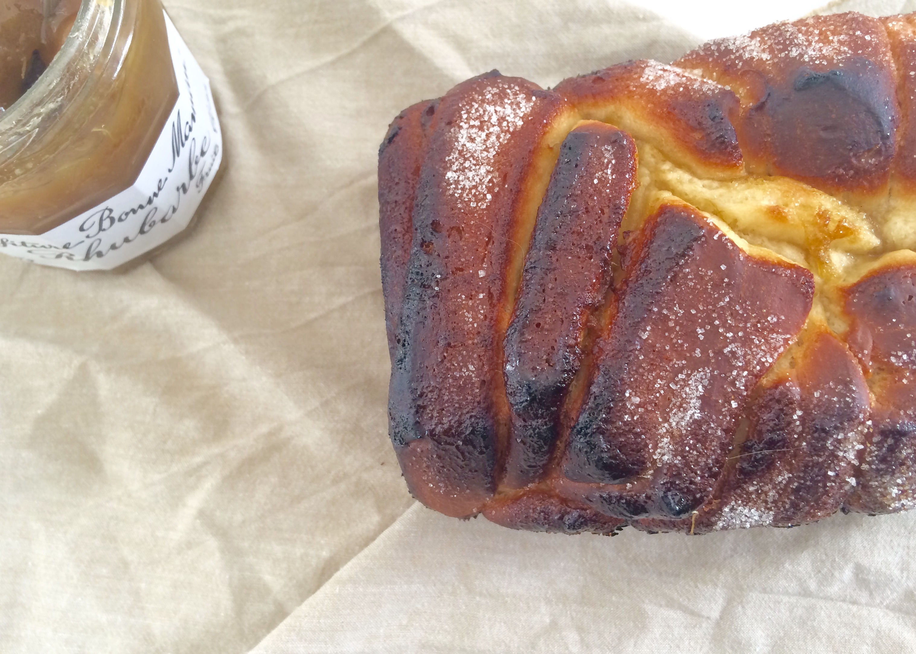 C’est celle à la rhubarbe que je me suis empressée de garnir cette brioche à effeuiller.