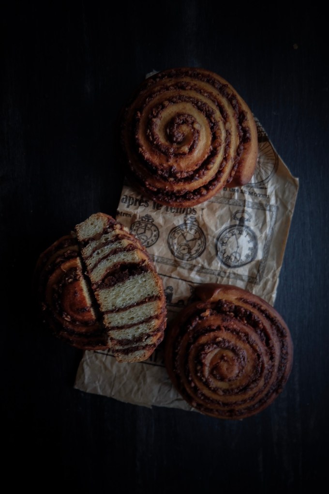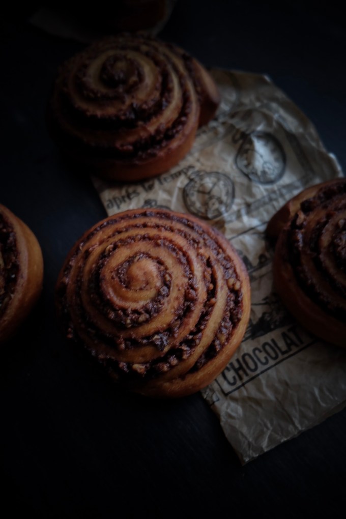 J’ai choisi de faire une garniture pleine de noix torréfiées en poudre, de cacao, de beurre et de cannelle.