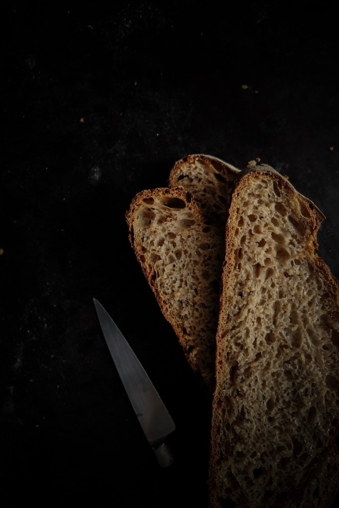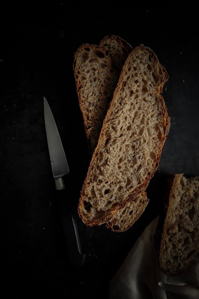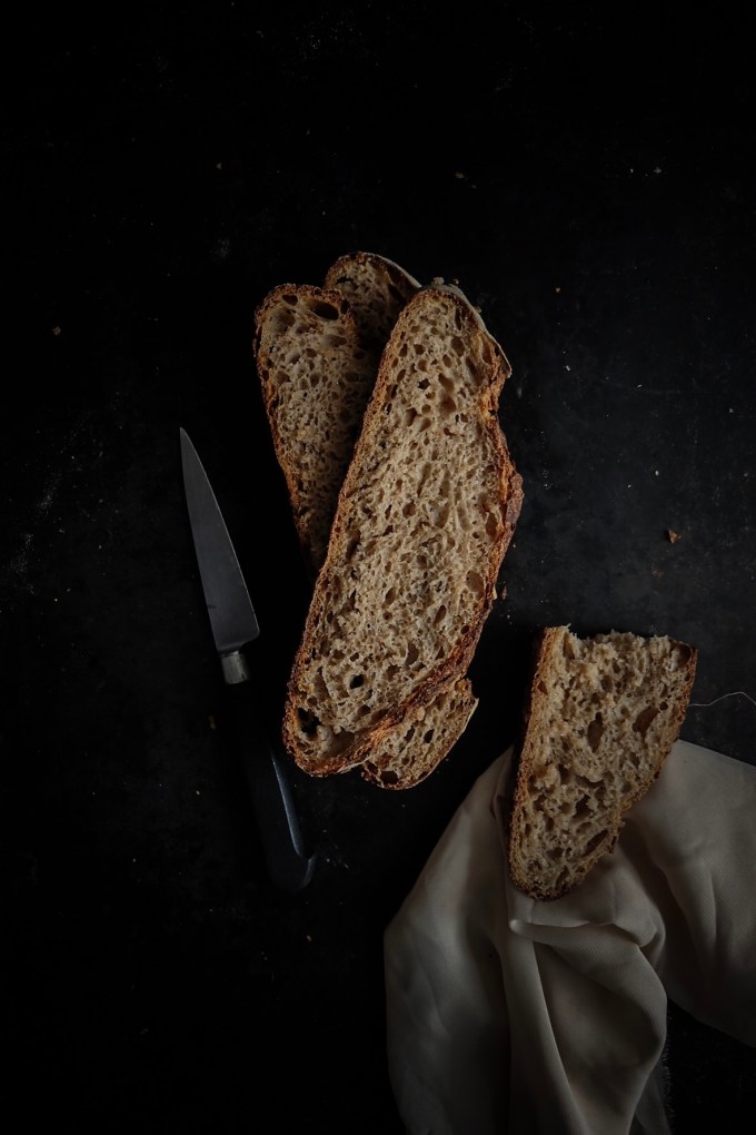 250g de farine type 65-80, 100g de farine de seigle, 50g de farine d’épeautre, 380g d’eau, 9g de sel et 75g de levain actif.