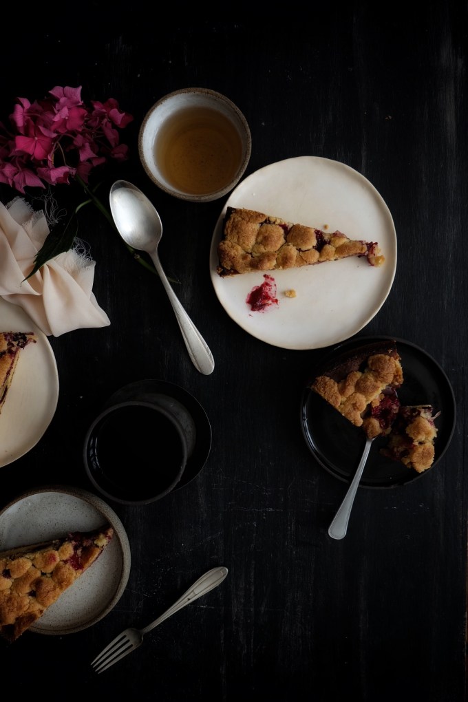 Utilisez ceux qui vous plaisent ; ici un mix de rhubarbe et de prunes rouges qu’il me restait après avoir fait une tarte rustique .