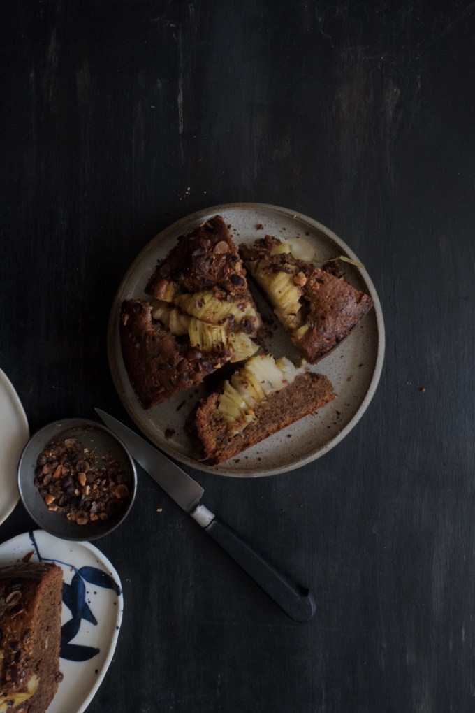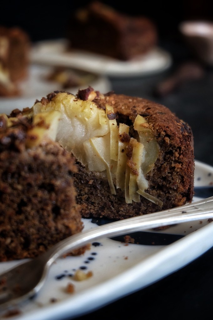 100g de beurre (salé ici), 250g de poudre de noisettes, 100g de sucre (muscovado), 4 oeufs, 20g de farine d’épeautre, 1 pincée de cannelle et 3 pommes