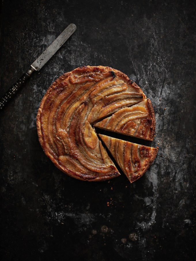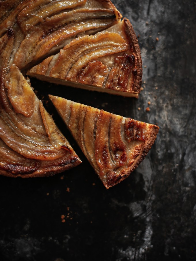 -Déposer harmonieusement les bananes caramélisées sur la crème face caramel vers le haut.