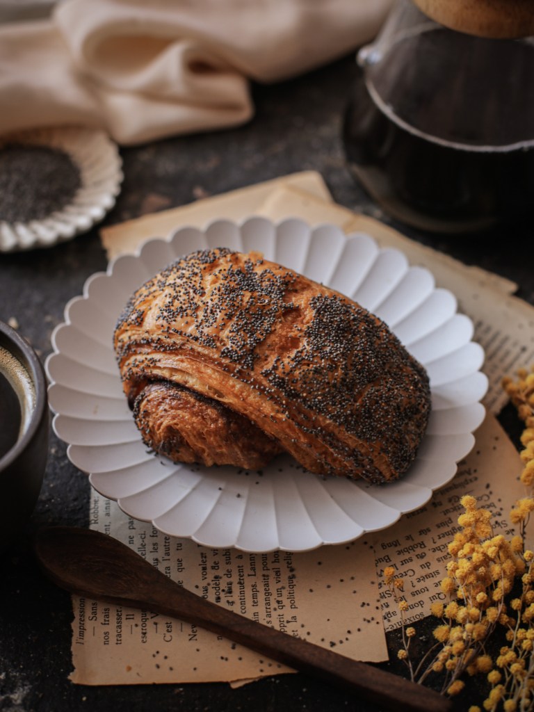 Un genre de brioche feuilletée garnie de pâte d’amande le tout recouvert de graines de pavot
